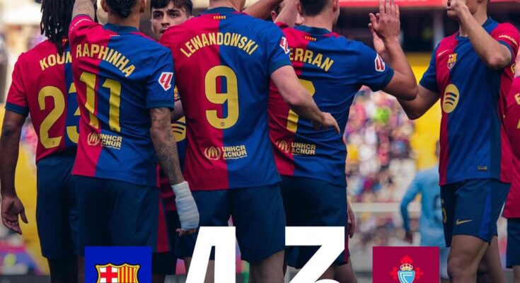 LaLiga leaders Barcelona fought back from 3-1 down to beat Celta Vigo 4-3 in a roller-coaster game Saturday, with a stoppage-time penalty by Raphinha extending their lead over Real Madrid at the top of the table to seven points.