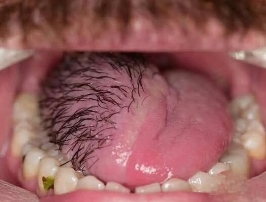 This is hair growing from a skin graft used to reconstruct a tongue damaged [devastated] by cancer.