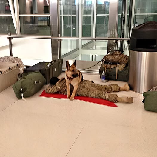 This was no ordinary scene of a man and his dog. This was a tableau of a bond forged in fire and quiet moments, a portrait of absolute trust. The dog didn’t move, didn’t get distracted by the sounds of a dozen languages or the blur of strangers passing by. He just kept his gaze steady, his ears perked ever so slightly, scanning the surroundings with calm, steady eyes. His posture was not one of a pet seeking comfort, but of a sentinel on duty, guarding the man he loved most in a world that, for so long, had been a place of uncertainty and danger. The sight of them—a soldier and his faithful companion, bound by an invisible thread of trust and love—brought a sudden, overwhelming flood of tears to my eyes. This quiet, unassuming display of loyalty was a powerful reminder of the sacrifices they had made together, a testament to a connection that ran deeper than words could ever express.
