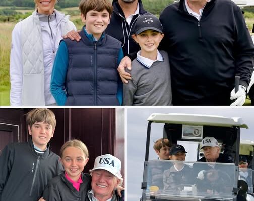 In a rare candid photo shared by Donald Trump Jr., President Trump is all smiles as he poses with his grandchildren, Spencer and Chloe, during a quiet moment at Trump Turnberry in Scotland. Bundled in matching jackets and beanies, the trio stood together in front of a scenic lighthouse on the coast.