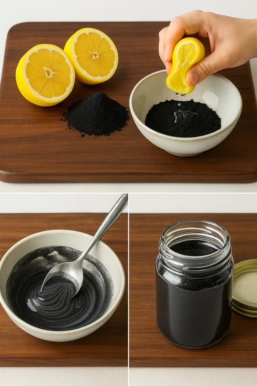 Mix equal parts lemon juice, activated charcoal, and sugar.